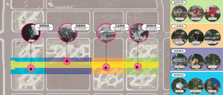 7块地中间的科普展廊上,围绕“自然科学-工业革命-信息革命-未来科技”进行设计,在公共环境中融入科技历史相关主题,让人们在城市漫步时就能感受科学的洗礼。