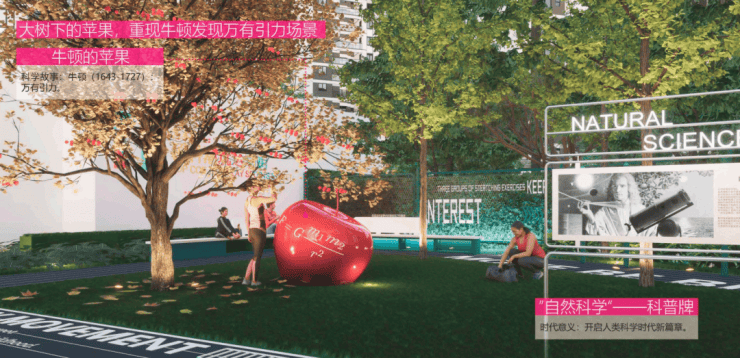为此,中建玖合为项目打造了“一廊七展厅”故事线,即1条城市科普展廊,7大社区科普展厅,在场景中解读科技历史和科技应用,成为一条“科学家星光大道”。
