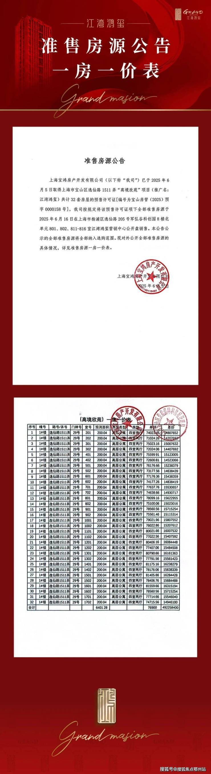 上海中环旁、四轨环绕江湾鸿玺今日正式开启认购,一房一价表发布: