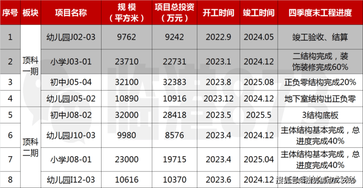 顶科社区公建配套学校建设计划:上实•听海毗邻的J10-3地块幼儿园计划24年12月竣工,J08-01小学和J08-02初中分别计划在25年4月和5月先后竣工。
