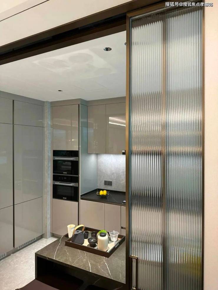 厨房玻璃门是上轨道移门,意味着地面部分没有任何轨道,不会有灰尘积攒,炒菜时关上,避免油烟散入室内;平时拉开,可以扩充室内视觉感受。🔥缦云上海售楼处电话:400-8787-740👈🔥