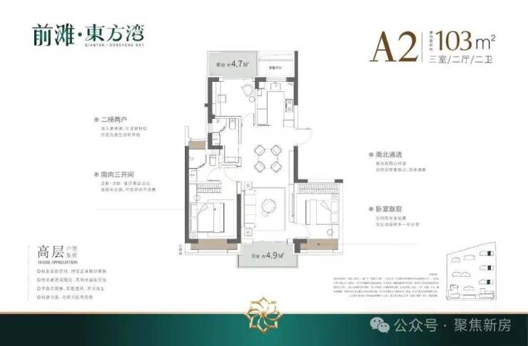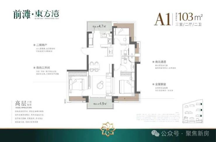 建面103㎡3房2厅2卫,户型三开间朝南、室内“5个飘窗+2阳台”,不管是采光、视野、通风、私密性,还是实用性都十分出色。