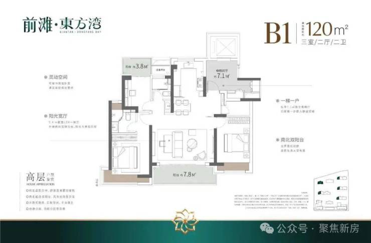 建面约120㎡3房2厅2卫,做到了3开间朝南+双阳台+主卧套房设计+270°转角飘窗,居住体验、舒适度、尺度感倍增。