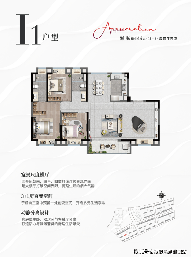 1、户型多元:该项目可满足市面客户一切需求,约110㎡-144㎡,刚需改善户型皆有;