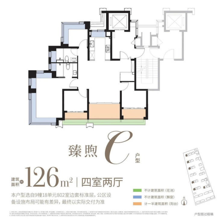 约126㎡4房:四开间朝南,附赠约30㎡,西边套一线临河,可享IMAX级观河景体验,全维度契合改善家庭的居住期待。