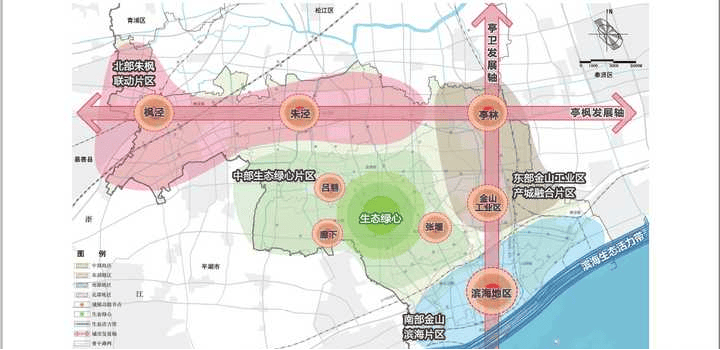 亭枫发展轴: 依托亭枫高速、亭枫公路以及规划中的南枫公路串联枫泾镇、朱泾镇和亭林镇,发展成为贯通北部地区的东西向经济发展轴,以生活功能为主,同时聚焦古镇文化旅游、服务业和居住等功能。
