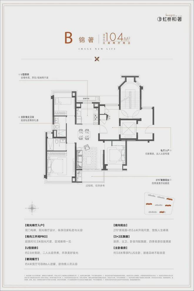 建面约104㎡舒适三房,三开间朝南+动静分区,设计水准颇高。特别是宽景阳台的设置,为客厅配备一幅iMax广角视野,多角度观赏社区美景,适配对品质有需求的首置或首改客户。