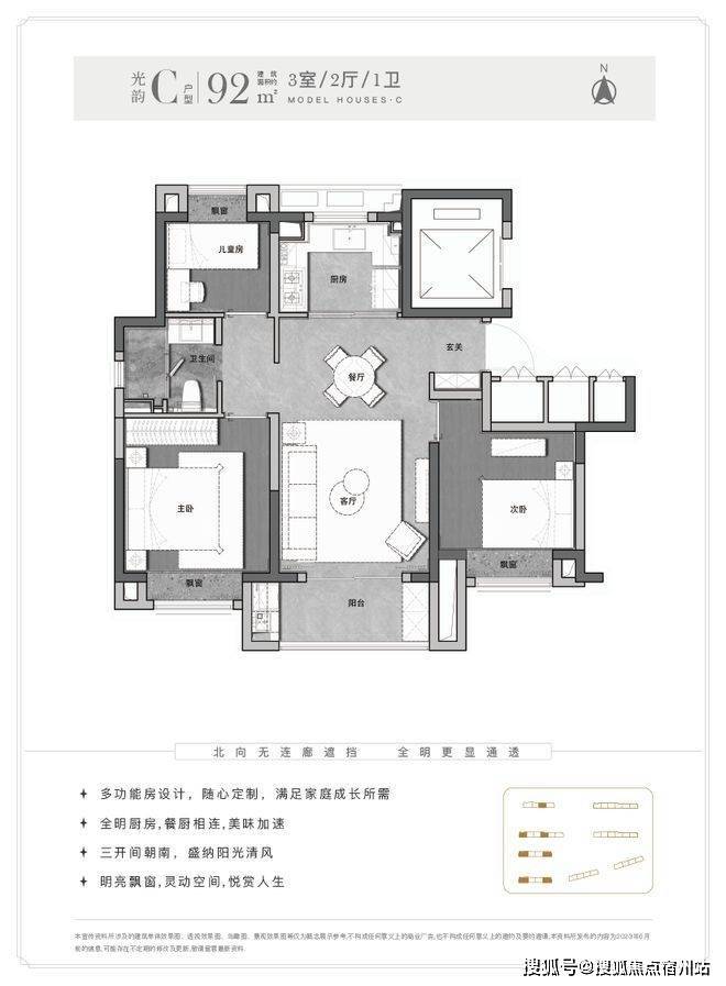 另外这个户型能更好实现南北通透,客厅-餐厅-阳台-厨房一线连通