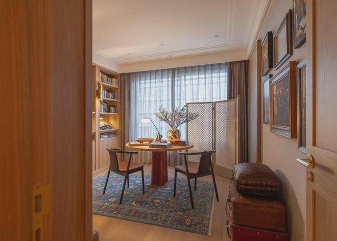 多功能书架彰显着设计的巧思,形成有如博物馆般的展示方式,即可放置日常读物,亦可展示珍本藏书。同时,利用屏风做隔断,与圆桌结合形成私密空间。