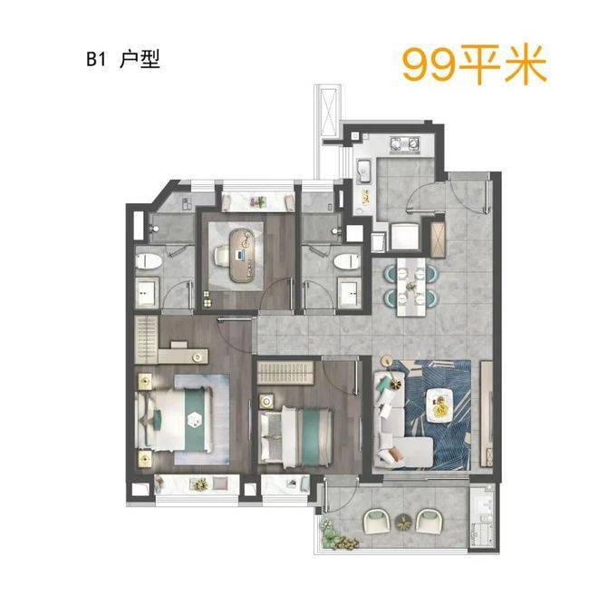 三卧舒适度均衡,均能做成完整卧室,避免了市面上99㎡普遍“2+1”的现象。