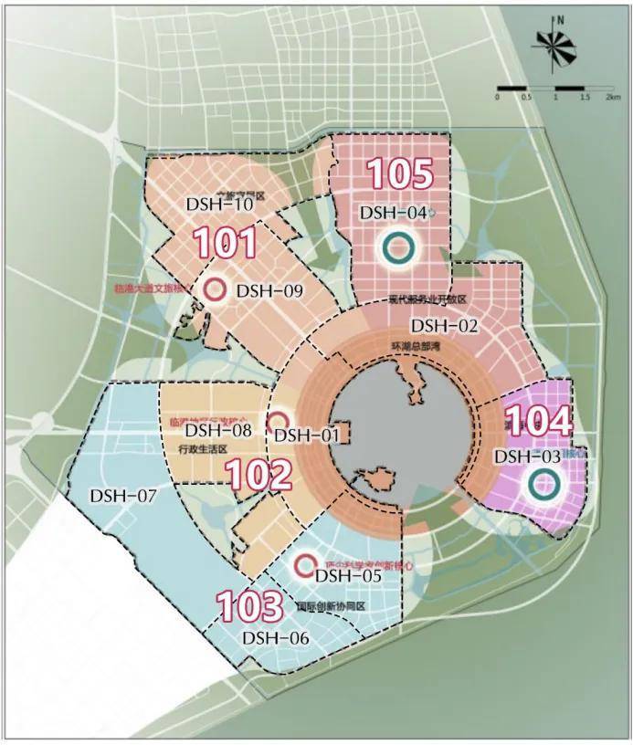 五片,在新片区总规提出的中央活动区、国际创新协同区、居住生活区三大功能片区基础上细化为五片分区(101至105)。