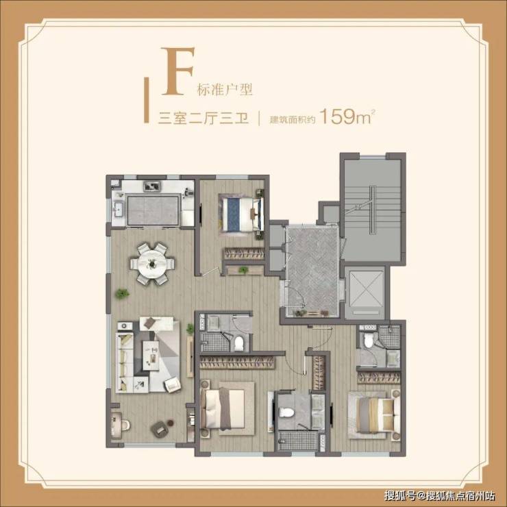 建面约134-159㎡大三房,除了 更大尺度的室内功能间,从 侧面的景观窗,还可以一览百万方中央公园的美景,同时 三个卫生间的配置能让大家庭生活更井然有序。
