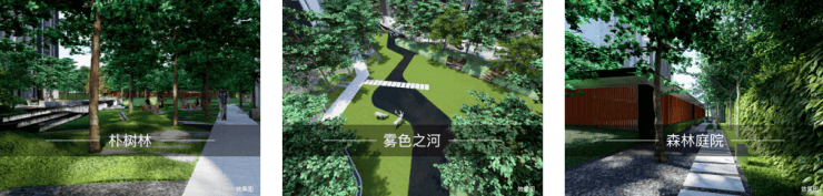项目绿化率约为35%,融汇“大自然编织”理念,入口庭院、叠水、朴树林、雾色之河、特色山丘、林荫步道等特色景观,注重强调环境功能的实用性以及居住者的互动体验。