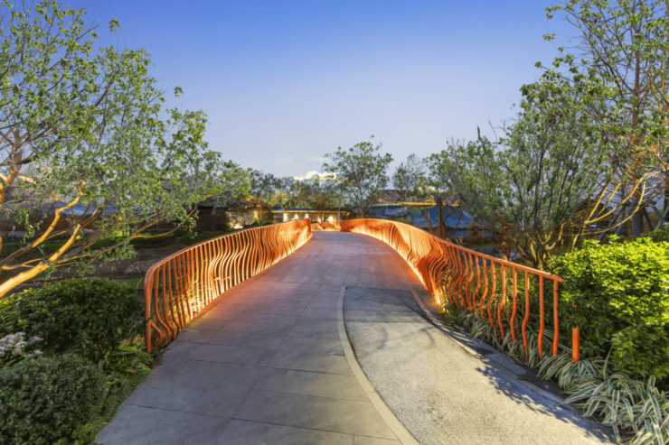 第一,项目由两条天然水系穿流而过,形成三座天然“岛屿社区”,开发商在三座“岛屿”设置不同主题,并铺陈丰富的景观节点。