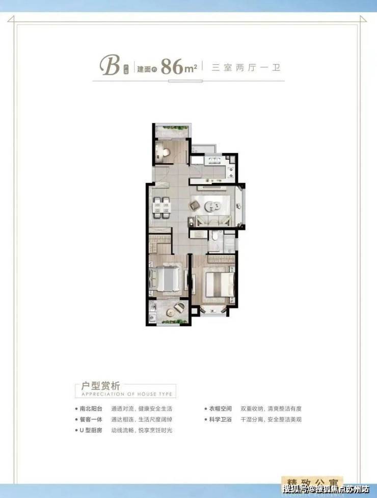 建面约86㎡3房2厅1卫户型特点:做到了双开间朝南+双阳台设计+卫生间干湿分离,一个非常紧凑的小3房户型。