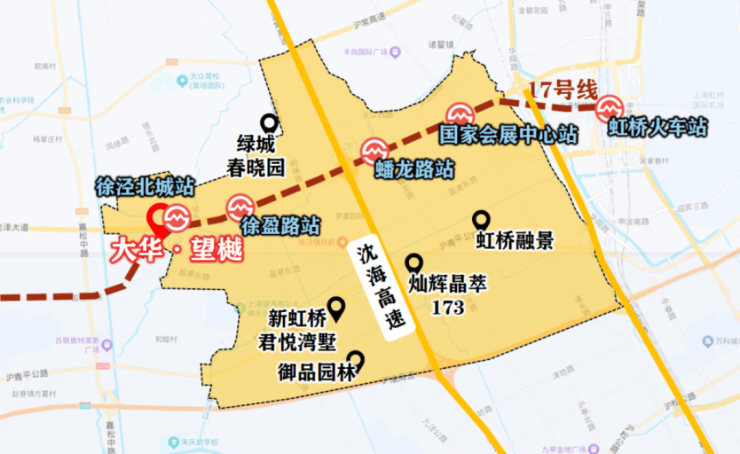 徐泾北城站1站可达徐盈路天空万科广场,2站至蟠龙古镇商业区,3站直达国家会展中心,——形成“三站联动”的生活闭环。
