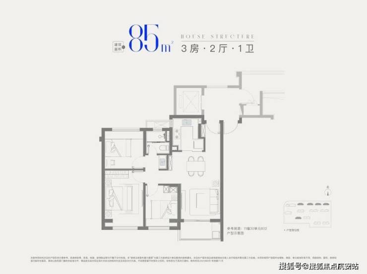 建面约85㎡3房1卫,做到三开间朝南+全卧室带飘窗+卫生间干湿分离+动静分离,非常紧凑的小3房。