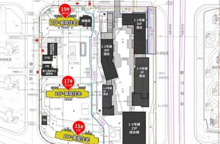 根据设计方案显示,该地块拟建3栋17-28F高层住宅、2栋30F酒店、1栋23F综合楼以及2栋3F商业;同时地块北侧设置有空中连廊,与北侧07-01地块万象系商业连通!