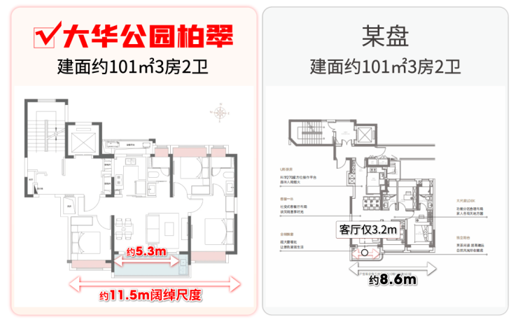 但大华公园柏翠的建面约101㎡3房2卫,却很好的解决了以上所有问题: