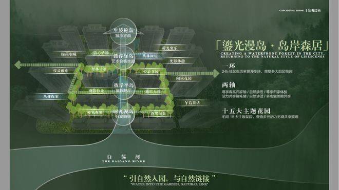 以“山水聚场”理念,规划“一环两轴十五园”景观布局,将水岸、岛屿、森林、花园、树屋作为园林节点,形成“行在景中、坐在岛中、游在林中、意在境中”的美学表达,营造出沉浸式山水活力场域。