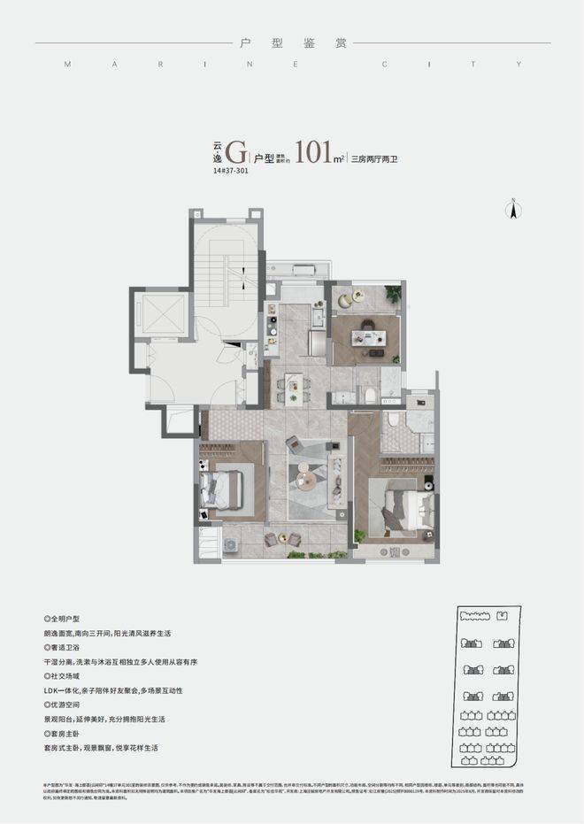 而中叠(建面约123㎡)则集便利与尺度于一身:不仅配备独立电梯厅,更以约13.4米南向面宽、约6米宽厅及南北双270°转角飘窗,营造出宽幕视野与通透空间,体感媲美整层大平层,实得率几近“满格”。