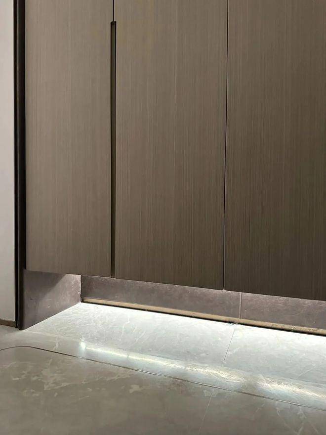 鞋柜下方做了悬浮处理,同样也是内嵌灯带,这里灯光的角度还会再调整,因为灯光映射在大理石地面上,要显得尽量柔和不刺眼;同时,鞋柜下方可放拖鞋,还能放扫地机器人,便于日常清扫打理。