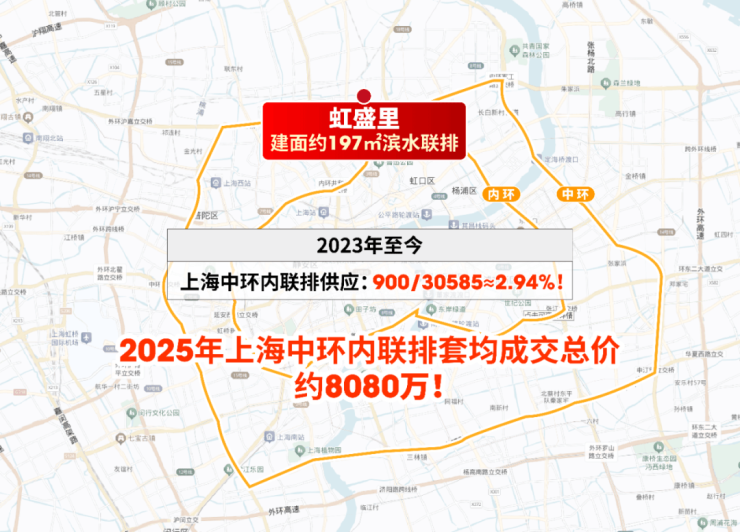 建面约197㎡滨水联排堪称中环稀缺藏品——2023年至今,中环内联排供应占比不足3%,套均成交总价高达约8080万(包含风貌)。虹盛里的联排不仅填补了区域市场空白,总价更具亲和力。