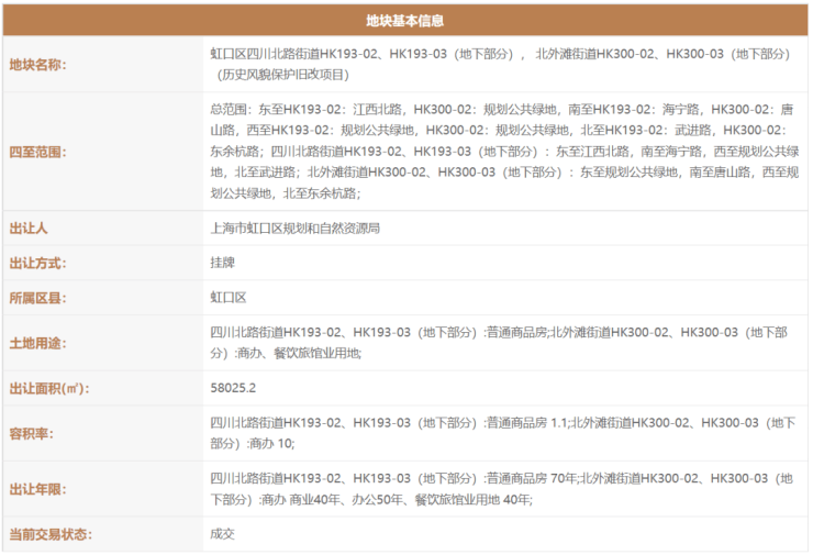 2021年2月,上海虹口城市更新建设发展有限公司(上海地产联合体)以111.35亿拿下了虹口区四川北路街道HK193-02(17街坊弘安里)、HK193-03(地下部分);北外滩街道HK300-02、HK300-03(地下部分)(历史风貌保护旧改项目)。