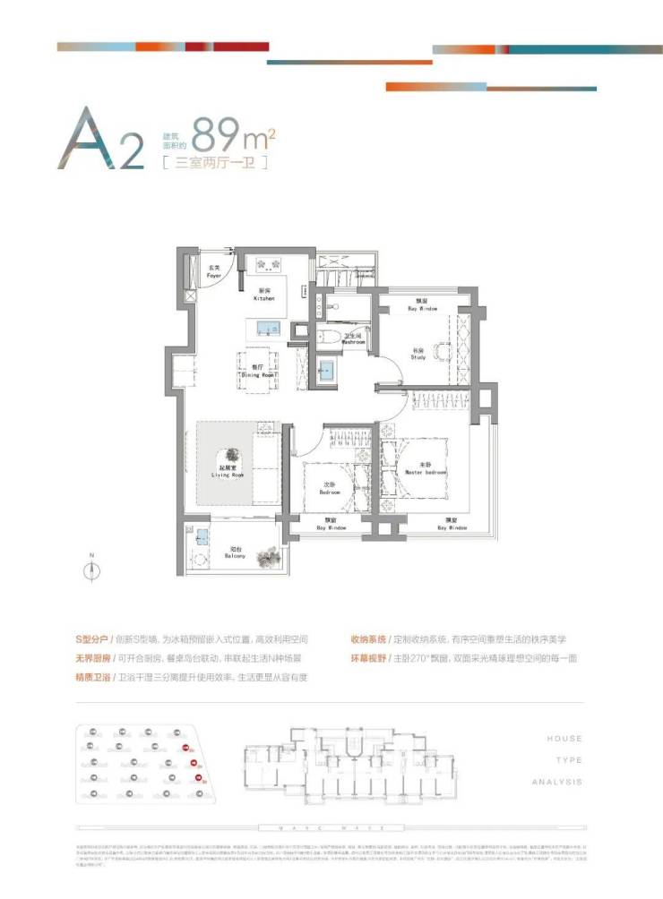 建面约89㎡3房户型:东边套主卧配置约270°双向采光飘窗、S墙设计,主力总价仅约450万级,首付约90万起!