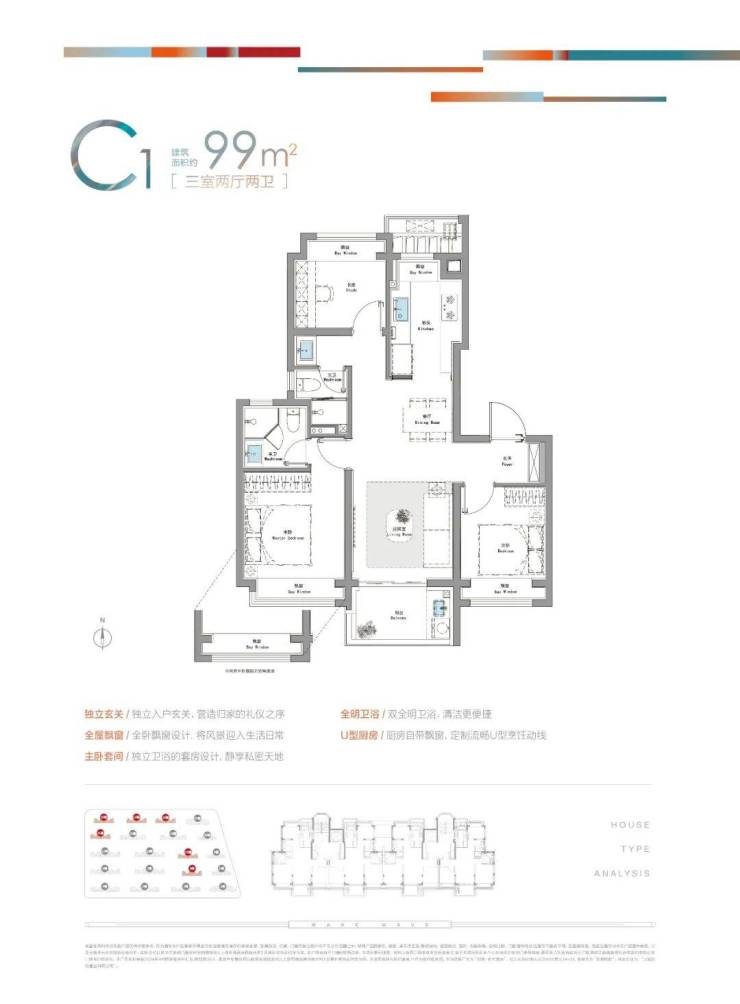 特别值得一提的是,建面约99㎡还做到了独立玄关+双卫配置,大大提升了业主的私密感