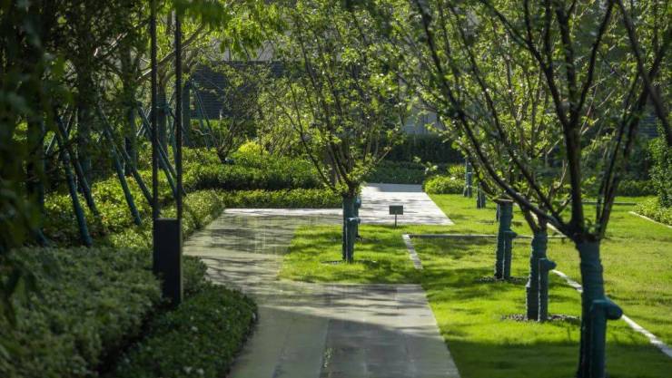 宅邸之间,尽显绿意,如同步入山林之间层次错落的植物群落软化场地间的硬质铺装,阳光渗入树梢,蔓延至生活的的每一处,借自然之色渲染人居环境,展现优雅惬意的生活场景。