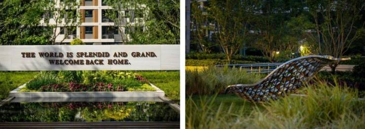 入户处的景观细节彰显着高品质的居住空间和雅致格调,质感的景墙、艺术的标识、色彩的植物,都渲染着温情的入户氛围,夜幕中发光的楼栋标识指引归家的路途,驱散城市的喧嚣与心灵的疲惫。