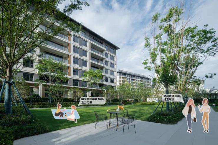 宅间景观以连绵的草坪、起伏的绿植、错落的铺装,模糊边界的同时与自然产生联系,用绿意消弭空气中游离的情绪,游走其中,渐入清幽佳境,感受诗意生活。