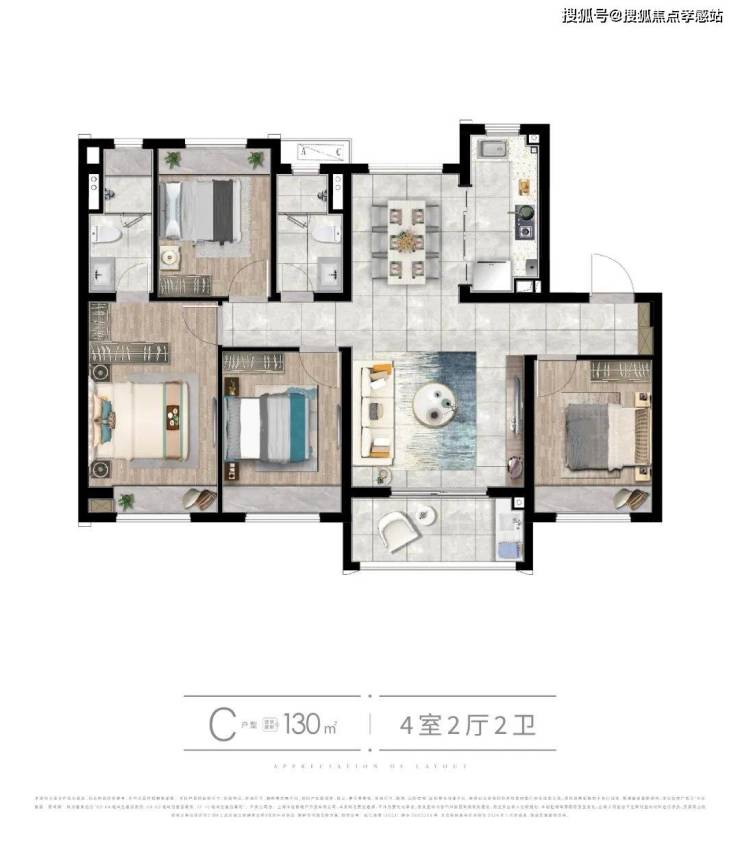 建面约130㎡的4房,4开间朝南,户型方正,南北通透,1梯2户,每个卧室都带飘窗,既延展使用空间,又优化了通风和采光。餐客厨阳一体化,动线流畅,大气开阔;主卧套房设计,总价约700万起。