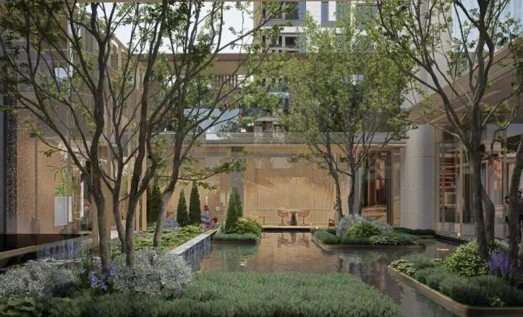 向城市让渡一些开放空间,以前街后河、约12000m滨水公园(代建)等一体化柔性边界,打造「外揽城市绿肺,内藏森境天地」公园住区,让繁华都市与静谧生活自然过渡。