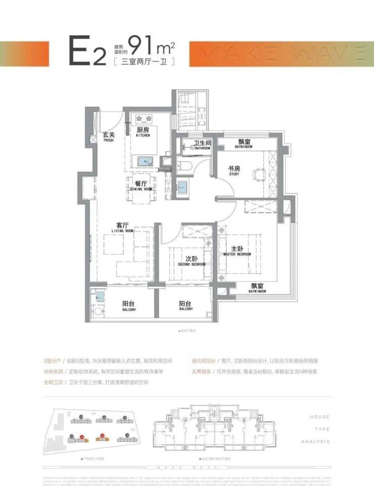 而招商·时代潮派|东屿此次建面约91㎡户型,就做出来了比市面百平户型更好的的“南向双阳台+南北双飘窗”设计。