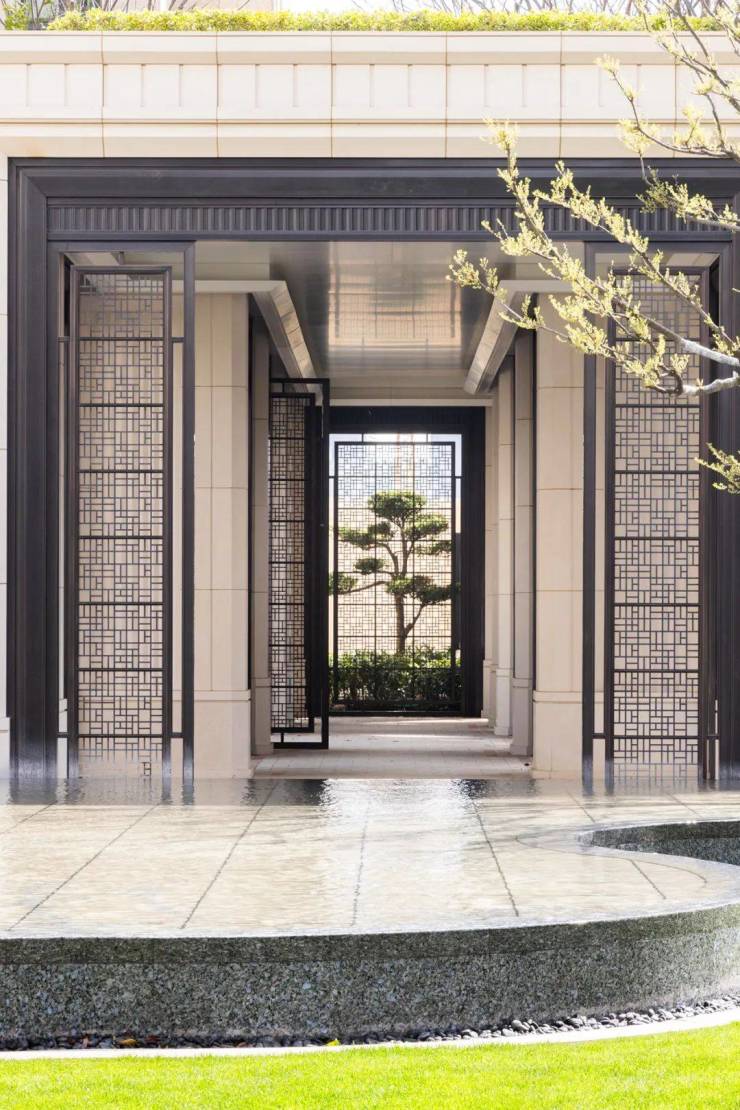 再来看公区,庭院的格栅,同样做了造型化处理,镂空形状不一,随着日光位置的变化,阳光洒落,造型十分灵动。