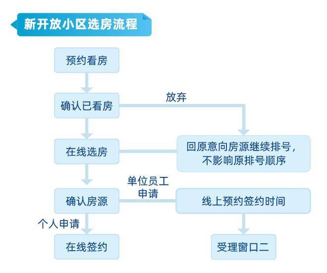 开放新小区选房规则:轮候状态的所有申请人可在预约看房时间段内通过“个人中心-我的预约-我要约看新小区”,并在看房结束后通过“个人中心-我的预约-确认看房”。请在以下在线选房时间前往“在线选房-新开放小区”进行在线“选房”。