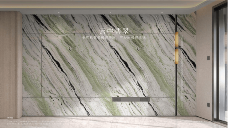 充分考虑业主的个性化需求,在电视背景板提供了 新潘多拉、云中翡翠、弗朗明戈金 三种结晶釉面岩板选择,成本更高,施工难度也更大。