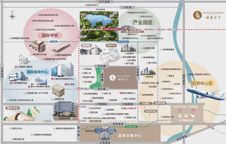 立体交通:虹桥交通枢纽,机场,高铁站,地铁(2.10.17号线),公交,出租等立体交通路网;