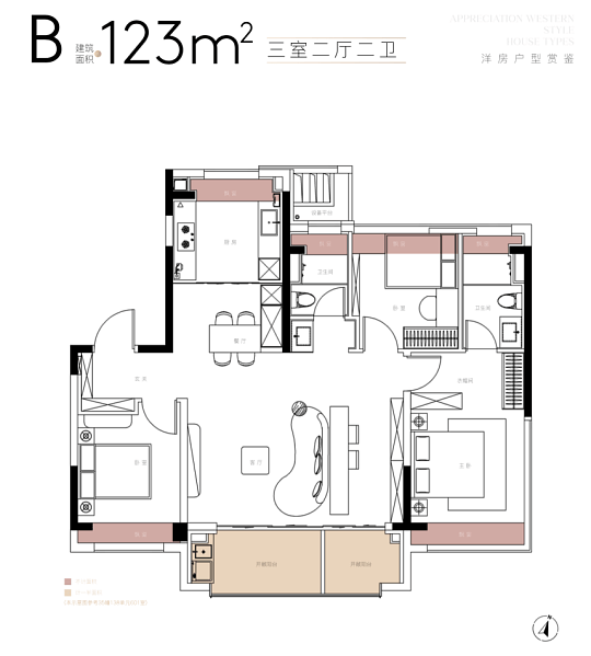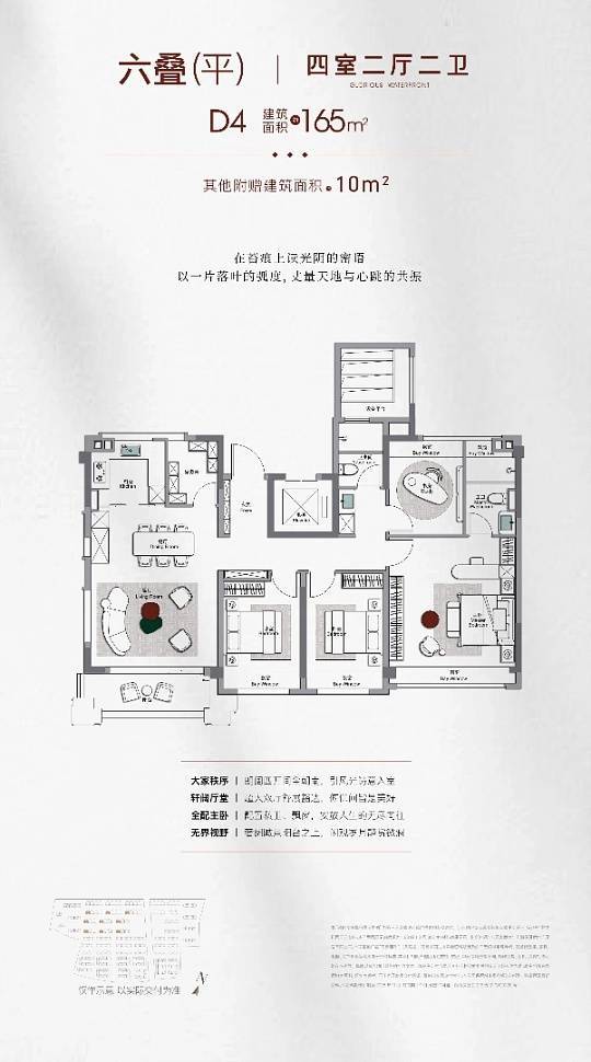 建筑设计深植切尔西式豪宅美学精髓,外立面采用珍稀石材,每平米板材成本超2克黄金,通过经典比例复刻、对称美学构图及多层次细节铺陈,凝练出低调内敛却暗藏威严的贵族气韵。户型设计上,三房户型采用四开间朝南布局,客厅面宽达4.5米,南北通透;叠墅产品上叠享私属露台,下叠配独立庭院,实现“院子里的中国式生活梦想”。