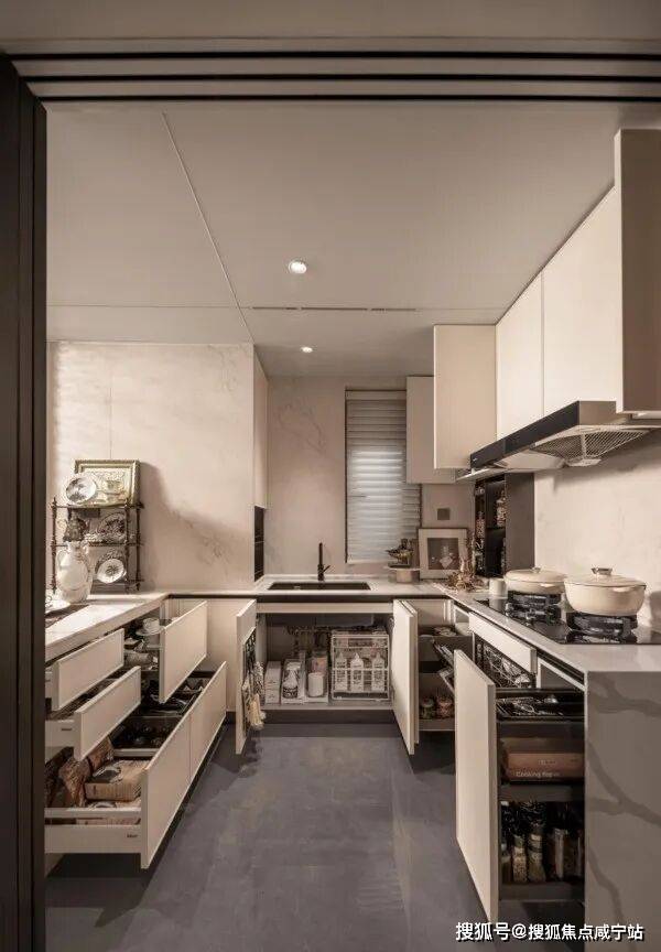厨房更是堪称美食达人的天堂,集成一系列多功能调味拉篮、定制谷物抽屉等,收纳有序,油盐酱醋间的分类放置烦恼一次性得到解决,琐碎繁杂不再。