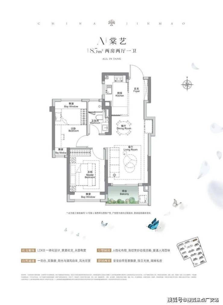 建面约105㎡3房2厅2卫,做到了三开间朝南+4个飘窗+双面阳台系统+主卧套房设计+270°转角飘窗,该户型的居住体验、舒适度、尺度感,是同级别产品所无法比拟的。