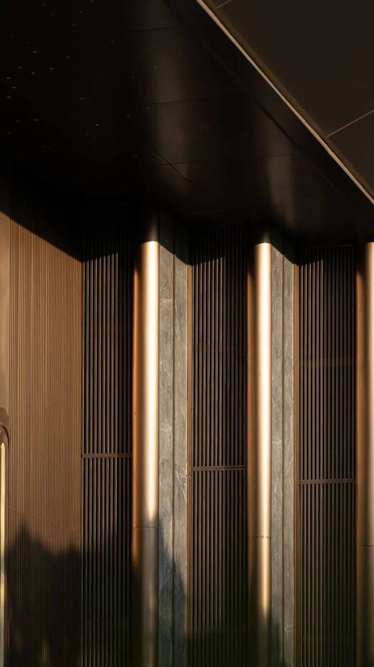 其中大门立面金属与仿石材搭配设计,金属格栅细节丰富,仿石材纹理清晰,颇有豪宅的气质和质感。