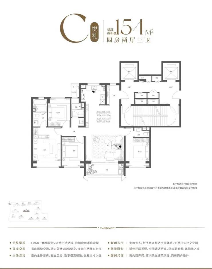 4房2厅3卫设计,整体格局方正,南北通透,四开间超14米奢阔尺度,阳光清风肆意流淌。约9.9米阔绰LDKB一体化空间,大尺度的竖厅设计,容纳多元家庭欢欣团聚。