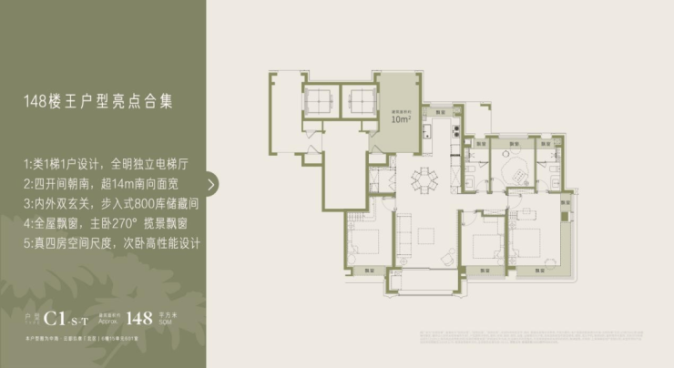 建筑面积约148㎡阔尺四房:高阶改善的奢居范本:类1梯1户设计,全明独立电梯厅营造归家仪式感;近14米南向面宽+四开间朝南,餐客厅一体化社交空间贯通景观阳台;内外双玄关+步入式储藏间,解决收纳痛点;主卧套房配270°揽景飘窗,沉浸式享受滨江奢居体验,满足高净值家庭的品质需求。