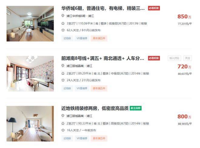 特别是浦江华侨城、浦江颐城晶寓、浦江颐城尚院这一批房龄较新的,挂牌价格大多稳定在8万/㎡左右。