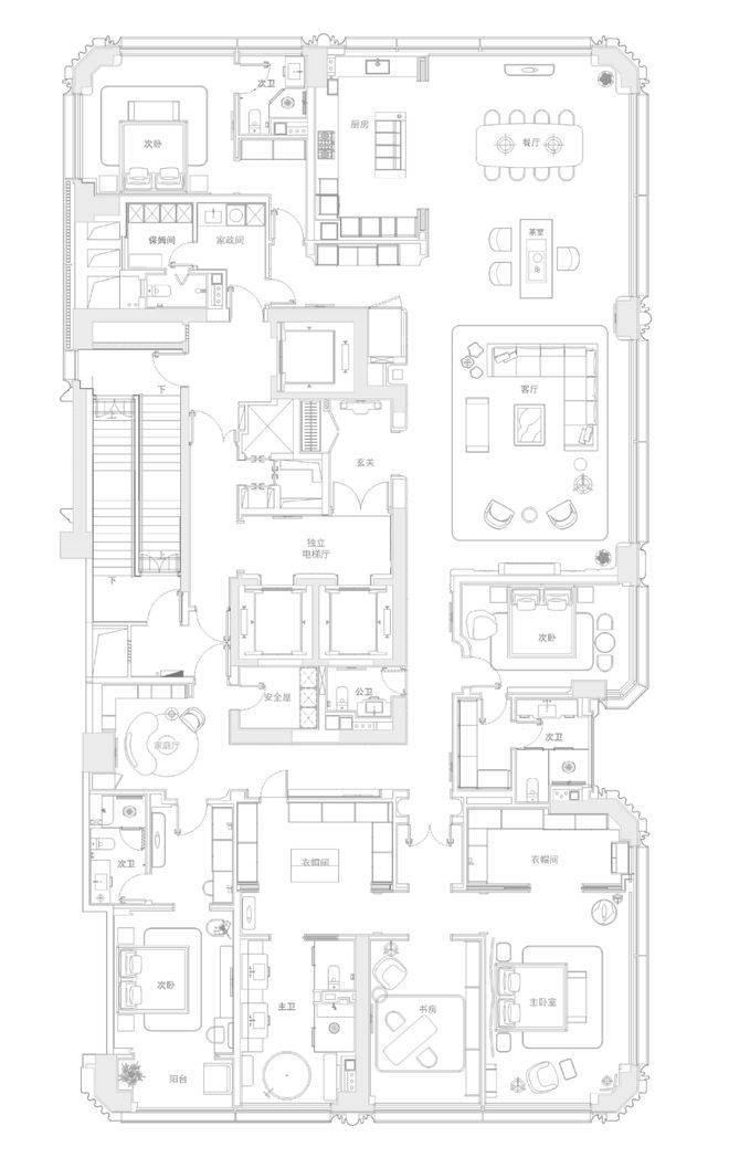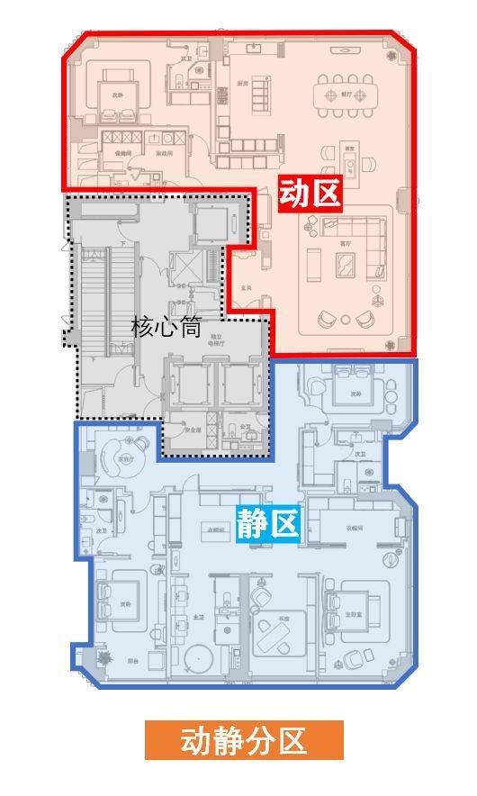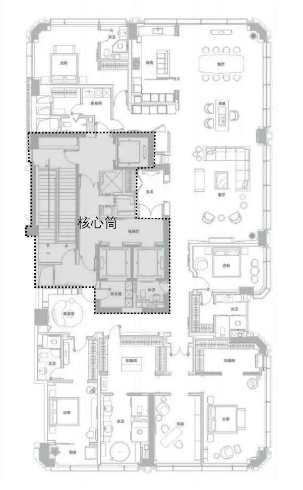 几乎1:1的动静面积分区,而且几乎是对称的布置方式,自然是迎合了不少顶级富豪“迷之自信”的心理需求。至于其他的LDKS一体化设计等,在这么大的户型里其实就不值得一提了。