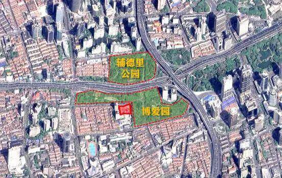 首先,这个项目的东侧和北侧有两个公园,分别是博爱园和辅德里公园。虽然面积不算很大,但是市中心有这么大的绿地,对于一个项目来说是极其稀缺的资源了。(如上图)