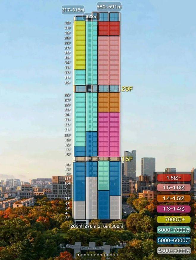 但如果都是590平左右的大户型,市场未必能消化的了。所以又将平面进一步进行了分解,就形成了竖向上的面积分层,户型变成了约280,300,320,580四个面积段。(如上图)